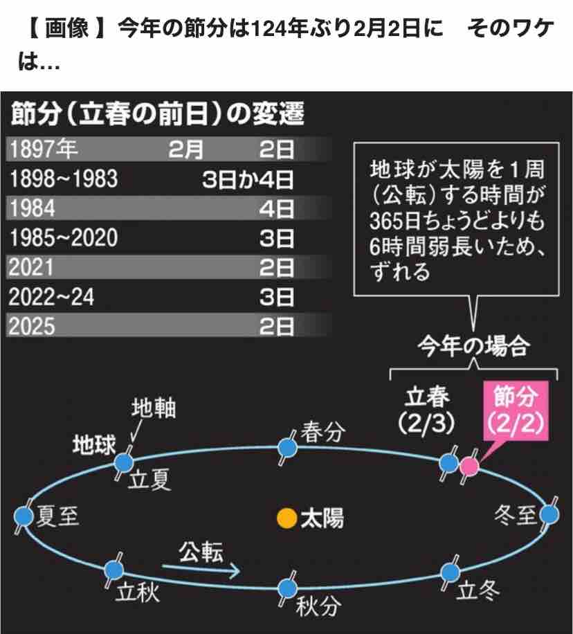 節分 2021年02月02日 こんにちは。高瀬です🌟今日は節分ですね❣️今年は124年ぶりに2月2日みたいです。来年の節分は?A 来年から24年までは2月3日に戻(もど)る。その後、25年にまた2日になるなど、少しずつ2日になる年が増えていく。国立天文台暦計算室の片山真人室長は「3日になったり2日になったりするので、豆まきをする時は気をつけて」と話しているよらしいです。旧暦の新年にですね。豆まきで厄払いでもしようかな…皆様が健康でありますように…本日もご案内可能❣️ < 前の記事次の記事 > コメント コメントフォーム 名前 コメント 記事の評価 リセット リセット 顔 星 情報を記憶 コメントを投稿する